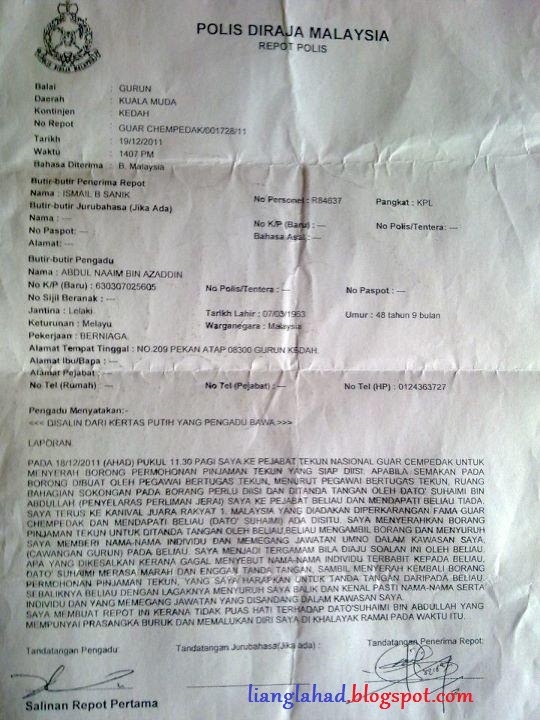 | Tekun : Pemohon diusir kerana tidak kenal Ketua Cawangan UMNO Posted: 26 Dec 2011 04:56 PM PST ![]() Seorang rakyat marhaen yang ingin membuat pinjaman dari Tekun untuk mengubah hidup,telah diperlekehkan oleh seorang pemimpin UMNO dihadapan orang ramai... Pemohon tersebut Abdul Naaim bin Azaddin,48 tahun telah "diarah balik" oleh Ketua UMNO Bahagian Jerai, Datuk Mohd Suhaimi bin Abdullah... Pemohon itu "disuruh balik" oleh pemimpin Ketua UMNO bahagian Jerai tersebut hanya kerana pemohon tidak mengenali nama-nama pemimpin UMNO di Cawangan Gurun (kawasan pemohon).. Mungkin jawatan beliau sebagai Ketua UMNO Bahagian Jerai sudah cukup tinggi untuk "menghalau balik" rakyat miskin yang datang untuk meminta bantuan.. Bantuan yang diperlukan dari Ketua UMNO Jerai itu hanyalah "sebuah" tandatangan.. bukan datang nak minta wang pun dari pemimpin UMNO tersebut.. Tetapi hanyalah tandatangan bagi mengisi ruang "sokongan" yang ada di dalam borang pinjaman Tekun tersebut.. Oleh kerana malu dengan insiden dimalukan dan diperlekehkan dihadapan orang ramai,pemohon tersebut telah pun membuat laporan polis.. Pemohon itu "diarah balik" oleh pemimpin Ketua UMNO bahagian Jerai tersebut hanya kerana pemohon tidak mengenali nama-nama pemimpin UMNO di Cawangan Gurun (kawasan pemohon).. Apakah ada syarat sedemikian di dalam syarat-syarat permohonan Tekun..? Sila lihat syarat-syaratnya di SINI |